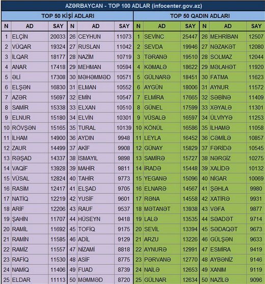 Azərbaycan ədliyyə nazirliyinin verdiyi məlumata görə oğlan adları arasında ən çox istifadə olunanlar ilk 11 ad bunlardır. 2009 2014 cü illərin ən məşhur və yayılmış adları müəyyən edilib. Qız adları və mənaları. Medeniyyetin ele yazindan bellidir yeqin sene bele deyilir her zaman.